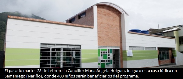 Según la Canciller María Ángela Holguín, más de cinco mil jóvenes se beneficiaran de las 12 casas lúdicas construidas por el Ministerio de Relaciones Exteriores, con el fin de brindarles alternativas a los niños, niñas y adolescentes en zonas de alta influencia de grupos armados para que desarrollen sus potenciales.
