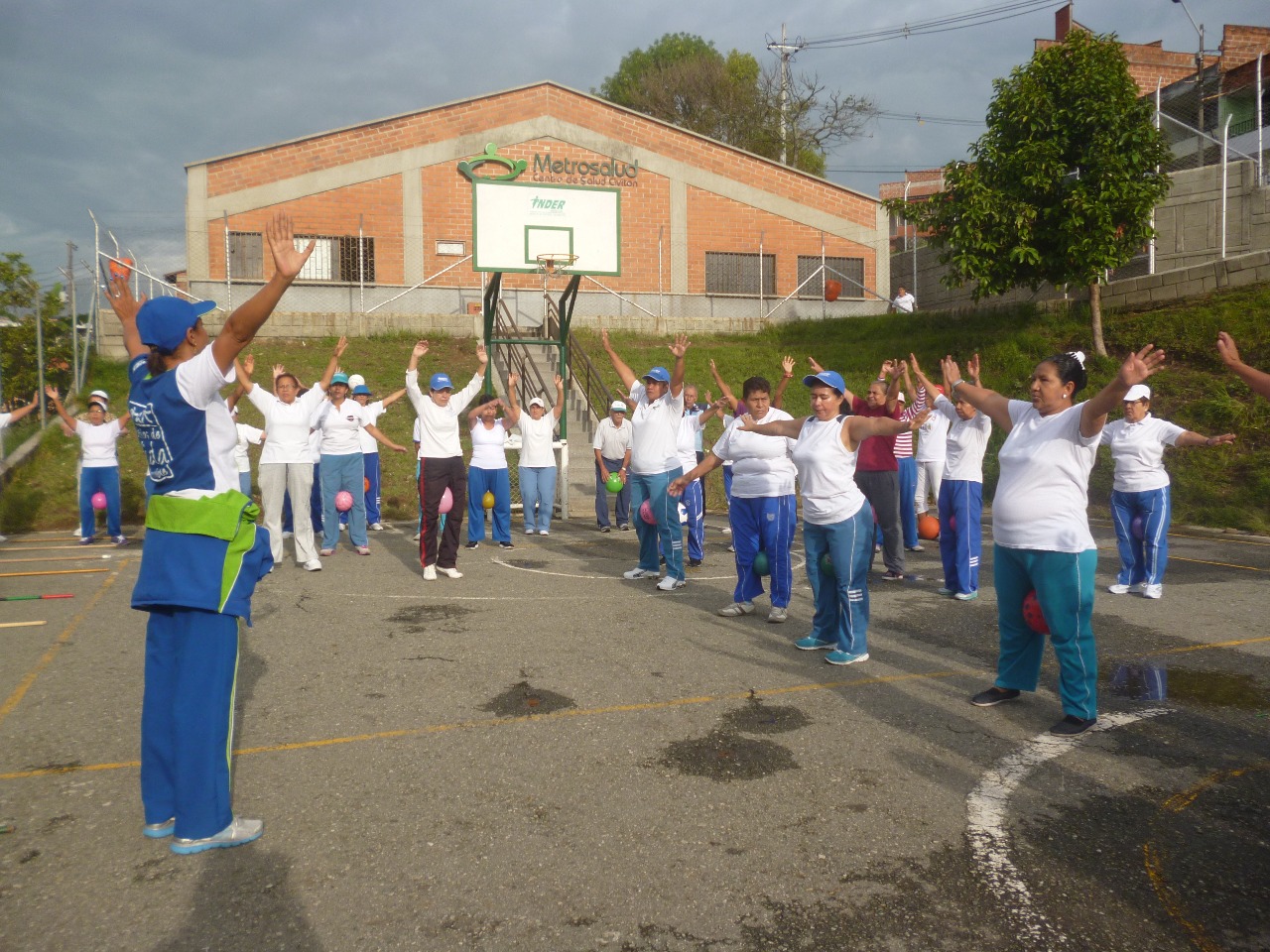 Gloria Saldarriaga es la profesora de gimnasia y dirige varios grupos alrededor del barrio, cómo este de los adultos mayores.